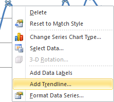 برای اضافه کردن Trend Line، مطابق شکل زیر، پس از راست کلیک کردن روی منحنی دادهها، گزینهی Add Trendline را انتخاب کنید تا پنجره Format Trendline باز شود.