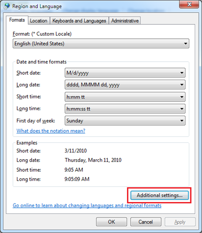 Control Panel –> Clock, Language and Region –> Change the date, time, or number format