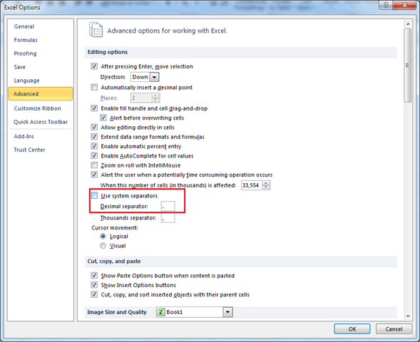 در قسمت Editing options تیک گزینه Use system separators را بردارید و علامت / را در قسمت Decimal separator تایپ کنید.