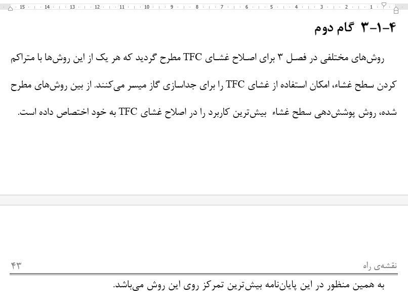 در این حالت شاید به ذهنتان برسد که فونت نوشته را کمی کوچک کنید تا تمام پاراگراف در یک صفحه نشان داده شود ولی کاهش فونت ممکن است متن را ناهمگون کند. راه پیشنهادی کاهش فاصله بین کلمات است که اگر این کاهش ناچیز باشد قابل تشخیص نیست مانند شکل زیر.