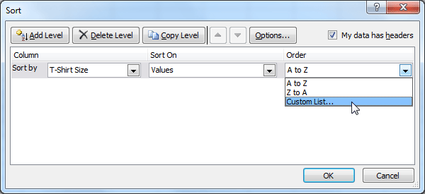 میخواهید سطرها را براساس ستون T-Shirt Size، به ترتیب Large، Medium، Small و X-Large مرتب کنید. چون نحوه مرتب کردن در اکسل براساس عدد و حروف الفبا و همچنین روزهای هفته و ماههای سال میلادی میباشد شما باید یک لیست سفارشی به لیستهای اکسل اضافه کنید تا اکسل بتواند اطلاعات شما را براساس خواسته شما مرتب کند. برای اینکار در پنجره Sort، در کادر Sort by ستون T-Shirt Size را انتخاب میکنیم. در کادر Sort On، پارامتر Values و در کادر Order، عبارت Custom List را انتخاب میکنیم.
