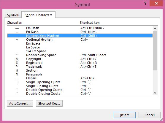 کد یونیکد هگزادسیمال این کاراکتر 00AD است. مشابه آنچه برای نیمفاصله بیان شد، خط تیره نشکن را میتوانید در تب Symbols با وارد کردن کد یونیکد00AD پیدا کنید یا در تب Special Characters از بین لیست کاراکترها، Nonbreaking Hyphen را بیابید و شرتکات مورد نظرتان (مثلا -+Ctrl+Shift) را برای آن اعمال کنید.