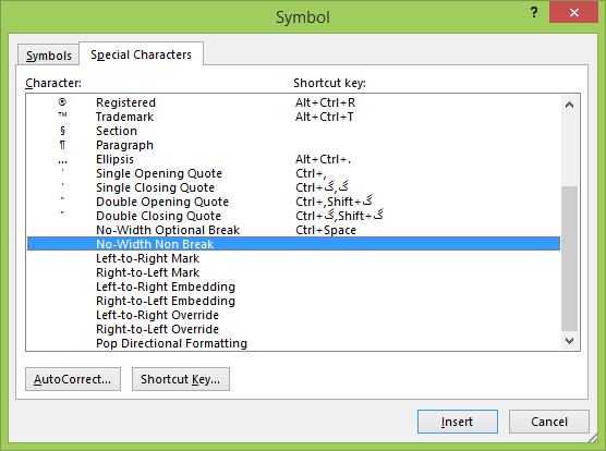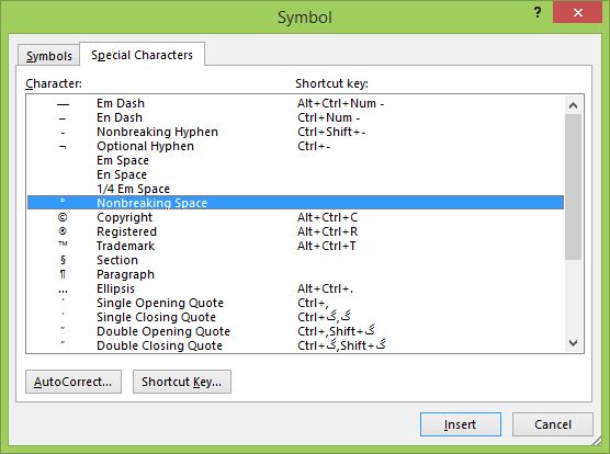 کد یونیکد هگزادسیمال این کاراکتر 00A0 است. مشابه آنچه برای نیمفاصله بیان شد، فاصله نشکن را میتوانید در تب Symbols با وارد کردن کد یونیکد00A0 پیدا کنید یا در تب Special characters از بین لیست کاراکترها، معادل آن یعنی Nonbreaking space را بیابید و شرتکات مورد نظرتان (مثلا Ctrl+Shift+Space) را برای آن اعمال کنید.