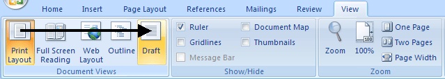 ۱- ابتدا از تب View و در قسمت Document view حالت نمایش را از Print layout به Draft تغییر دهید.